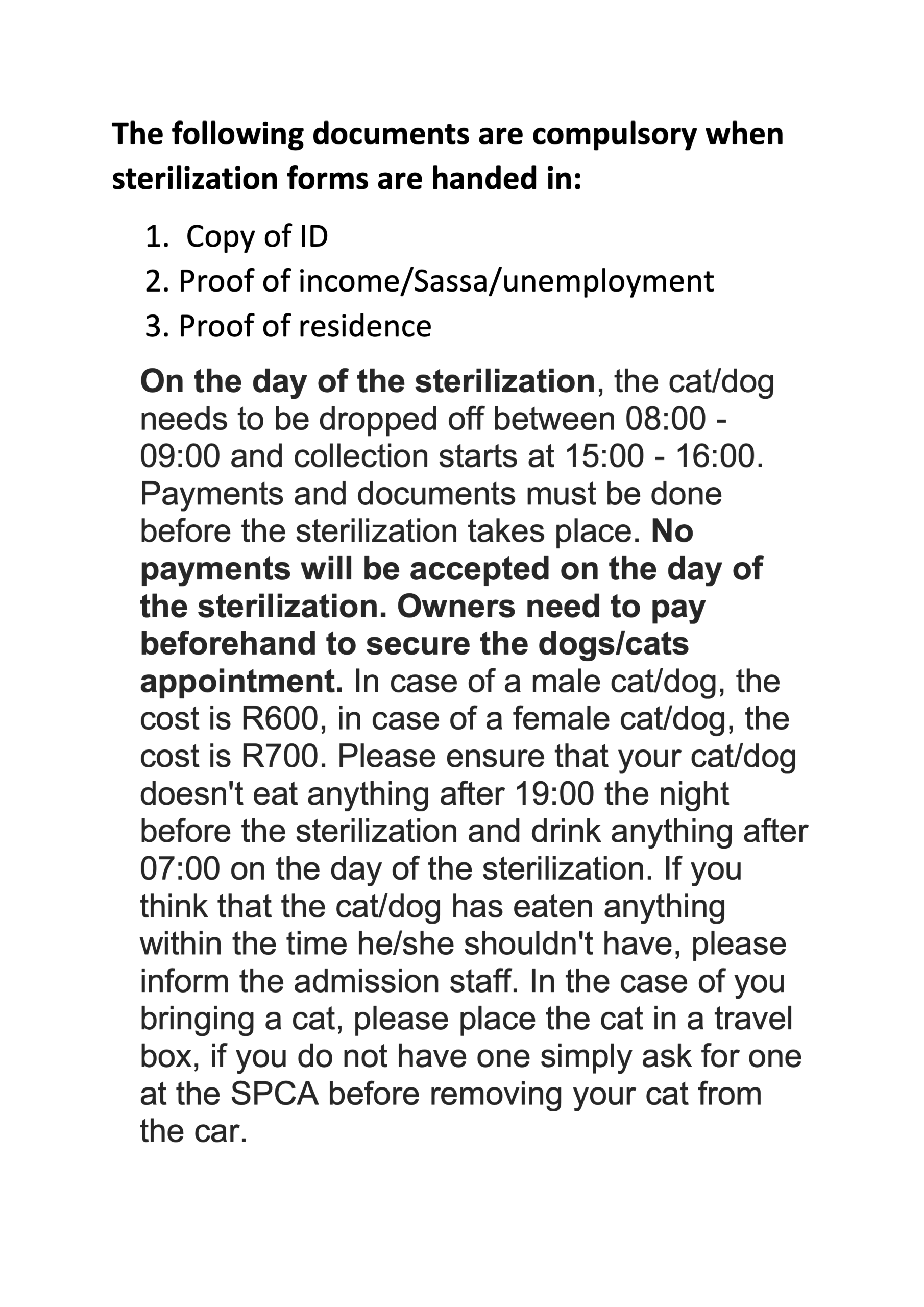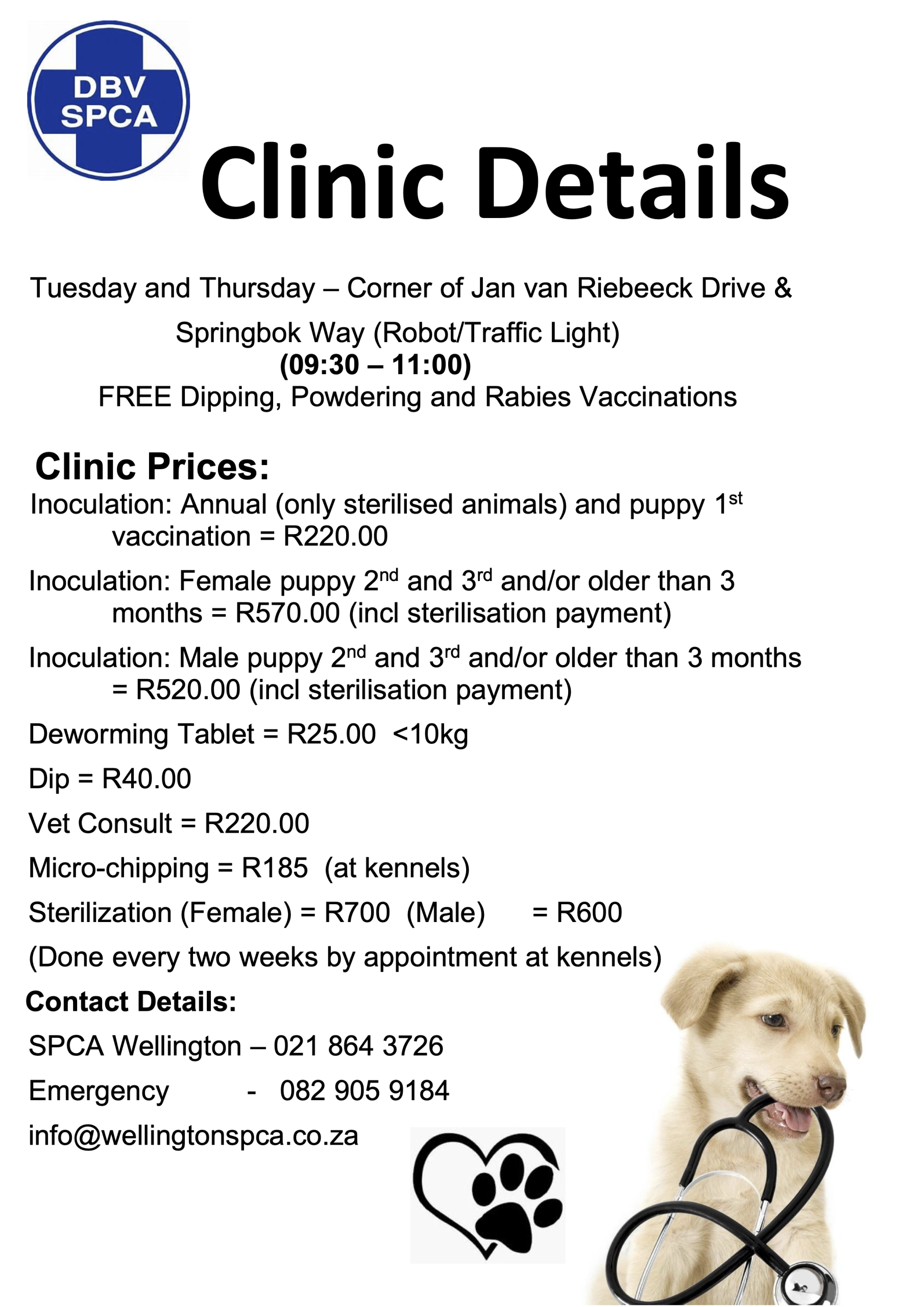 We are committed to sterilising every animal that comes through our doors in order to contribute to reducing the number of strays. The number of unwanted adult and young animals that are euthanised each year in South Africa is staggering. The only viable method to reduce this trend is large-scale sterilisation supported by continuous education. Currently we run bi-monthly steri drives in partnership with Vetsol where 20 – 30 animals are sterilised per drive. Sterilisations are scheduled by appointment only. To make an appointment please contact info@wellingtonspca.co.za